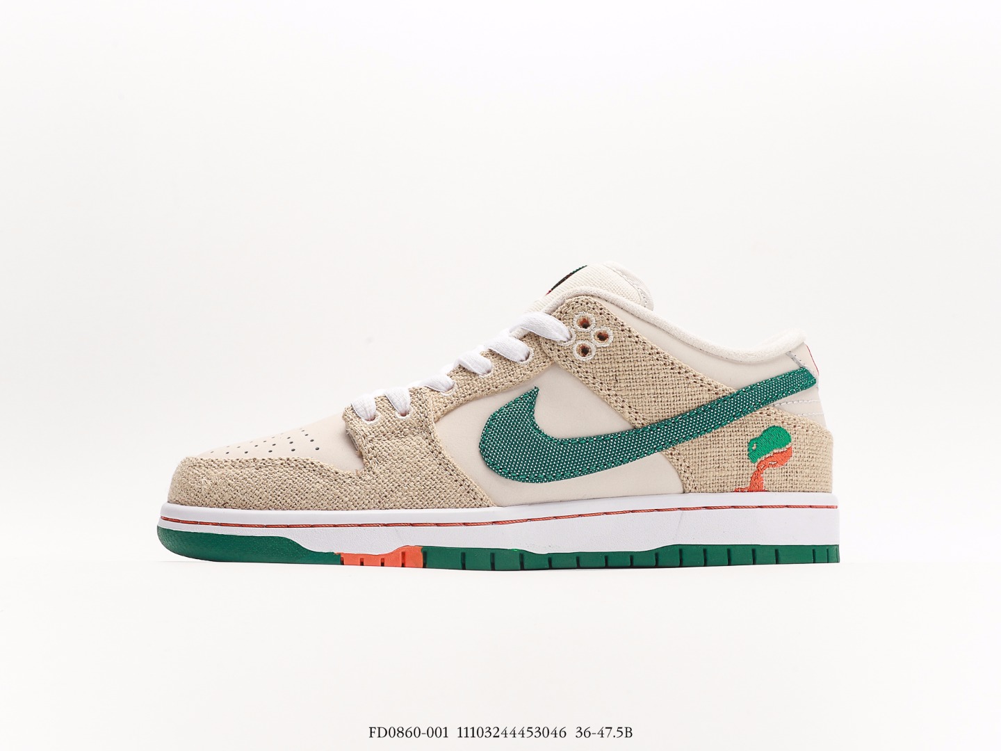 The Nike SB Dunk Low Jarritos is constructed using white leather and tear-away canvas materials across the uppers, while green accents help cover the outsoles and Nike Swoosh. Jarritos branding is seen throughout the insoles, heel tabs, and tongue of the sneakers. The limited edition sneakers come with orange, green, and white laces.